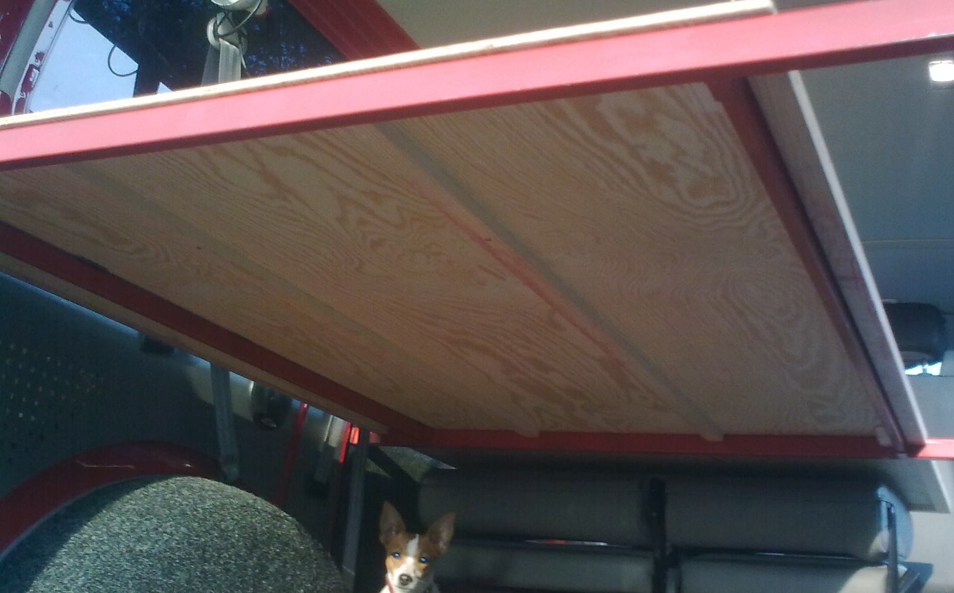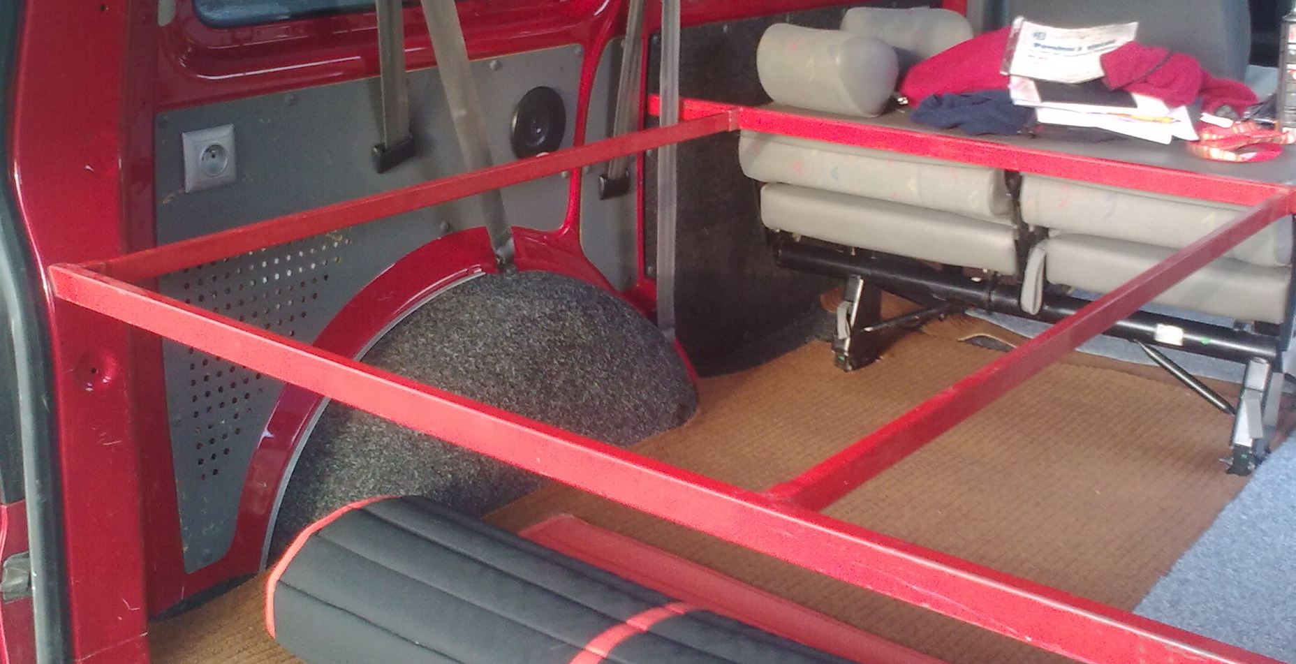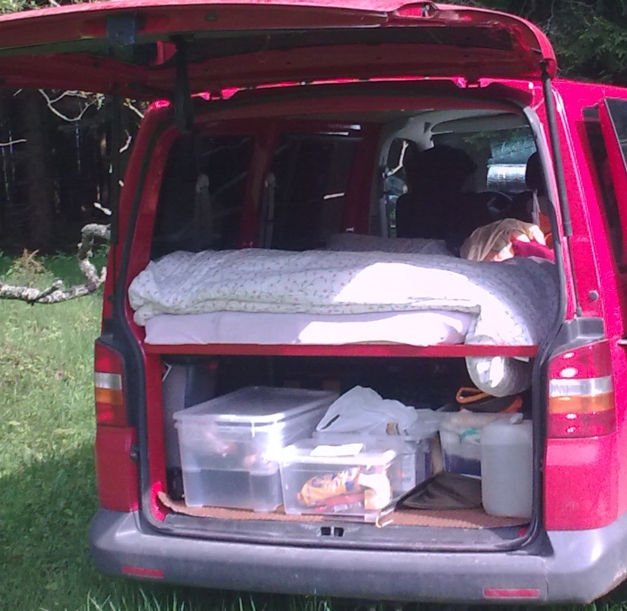 Začínali jsme v autě přespávat na dozadu sklopeném opěradle zadní lavice a vyrovnávací deskou mezi zadní a střední. Všelijaké vypodkládání však neskýtalo mnoho pohodlí.