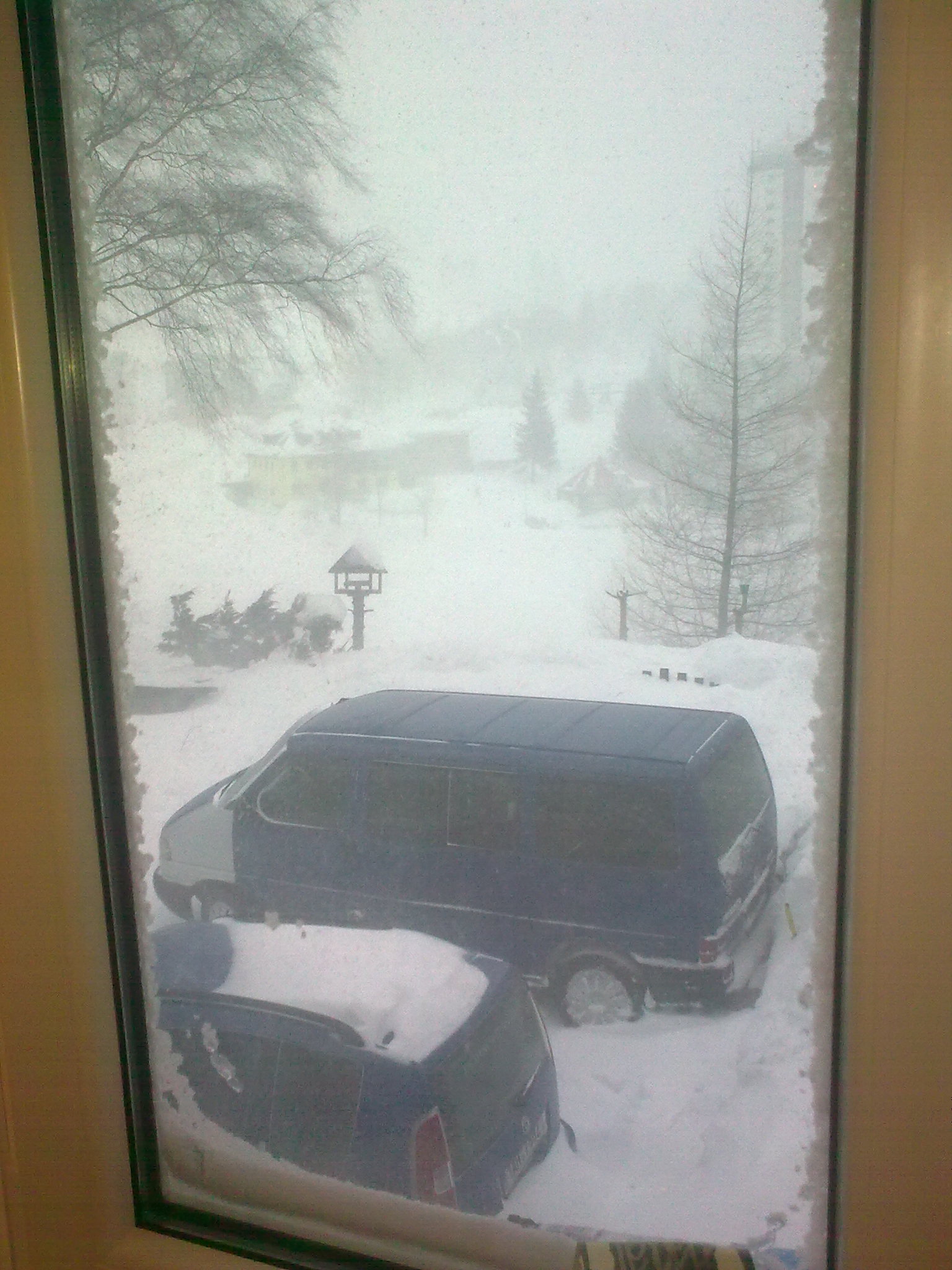 V pátek jsme se vrátili z Pece jen díky sněhové fréze. Ty auta pod ní jsme museli vyhrabat ručně a s pomocí malé ruční frézy. Malé osobáky nebylo vidět vůbec. Naše Šmoulinka stála až nahoře u chaty ošlehávaná větrem, tu jsem ani ometat nemusel :D