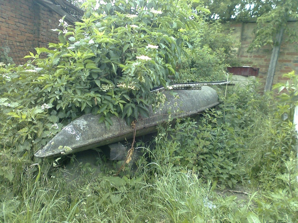 Dále jsem objevil kopyta na výrobu laminátových kanoí, windsurfovou plachtu s ráhnem, další sekačku....